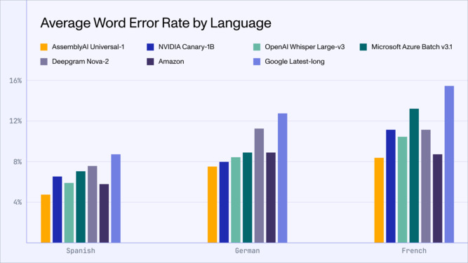 We are excited to introduce Universal-1, our latest and most powerful speech recognition model. Trained on over 12.5 million hours of multilingual audio data, Universal-1 achieves best-in-class speech-to-text accuracy across four major languages: English, Spanish, French, and German.