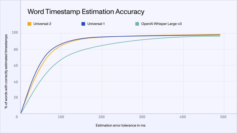 - Universal-1 improved our timestamp accuracy by 13% relative to Conformer-2, outperforming Whisper Large-v3 by 26%. [Link]
